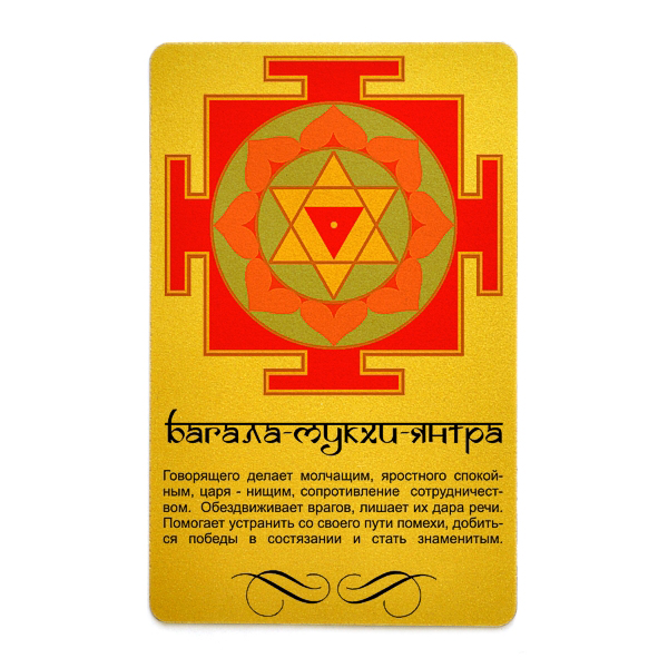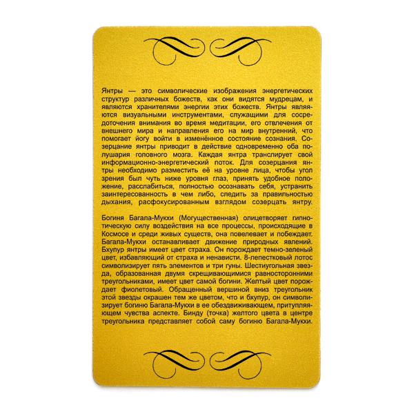 Карта с Багала Мукти янтрой изготовлена из золотистого пластика и имеет удобный размер – размер банковской карты. Это позволяет носить её с собой и при необходимости "подзаряжаться" общением с идущем через неё информационно-энергетическим потоком. Купить янтру Багала Мукти можно как для себя, так и в подарок близкому человеку, который способен оценить такой дар и возможность духовного самосовершенствования.