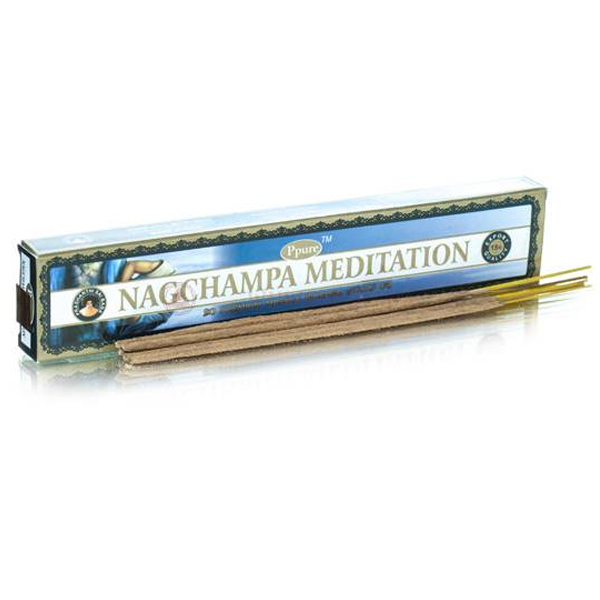 Ароматические палочки "НагЧампа Медитация" серии "масала", изготовленные вручную на основе бамбуковой лучины с древесным наполнителем, смешанного со смолой Чампы и мёдом. Полученный таким образом сладкий аромат уменьшает последствия стресса, улучшает сон, укрепляет нервы и помогает сконцентрироваться на умственной работе.