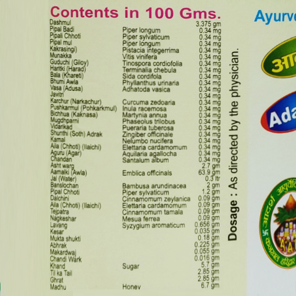 Широко применяется не только как сохраняющий здоровье и молодость аюрведический препарат, он может приниматься для очищения организма, особенно после 40 лет, для омоложения, улучшения работы печени, желудочнокишечного тракта и сердечно-сосудистой системы. Он рекомендуется к применению при всех острых и хронических заболеваниях дыхательных путей, в том числе при астме, пневмонии, ларингите, катаре верхних дыхательных путей. Способствует быстрому отхождению мокроты, чем приносит значительное облегчение при всех видах кашля.