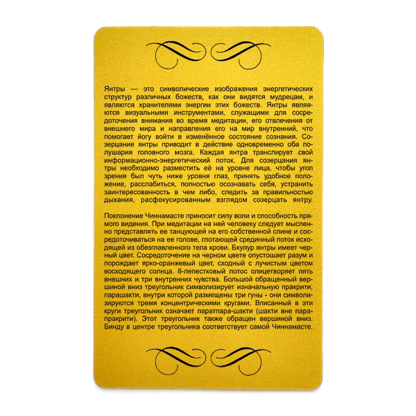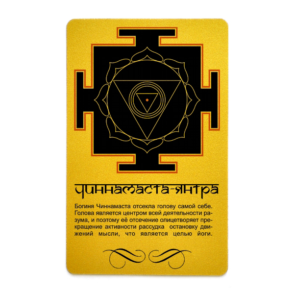 Карта с Чиннамаста янтрой изготовлена из золотистого пластика и имеет удобный размер – размер банковской карты. Это позволяет носить её с собой и при необходимости "подзаряжаться" общением с идущем через неё информационно-энергетическим потоком. Купить янтру Чиннамаста можно как для себя, так и в подарок близкому человеку, который способен оценить такой дар и возможность духовного самосовершенствования.