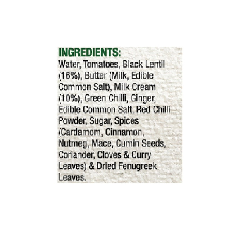 вода, томаты, чёрная чечевица (16'%), сливочное масло (молоко, соль), молочные сливки, зелёный перец чили, свежий имбирь, соль, красный молотый перец чили, специи (кардамон, корица, мускатный орех, мускат, семена тмина, кориандр, гвоздика, листья карри), сушёные листья пажитника.
