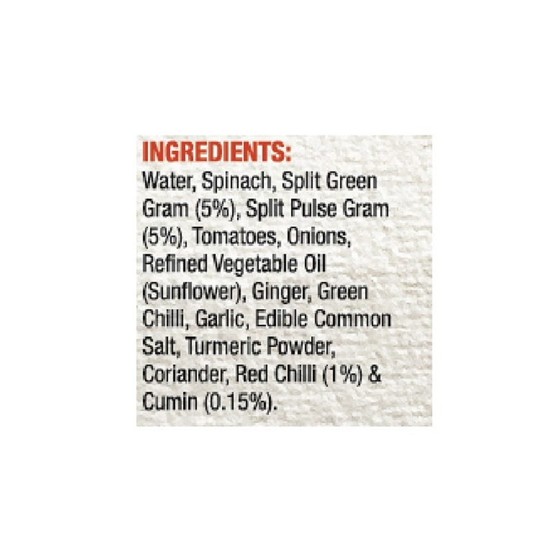 вода, шпинат (15%), дробленый зеленый маш (5%), дробленная красная чечевица (5%), помидоры, лук, рафинированное подсолнечное масло, свежий имбирь, зеленый перец чили, свежий чеснок, соль, порошок куркумы, кориандр, красный перец чили, тмин.