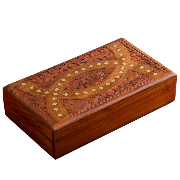 Купить деревянную резную шкатулку с инкрустацией из латуни Око Мира, 25х15 см