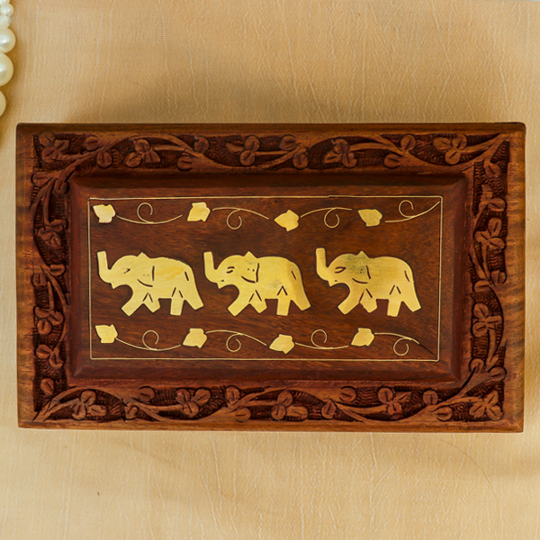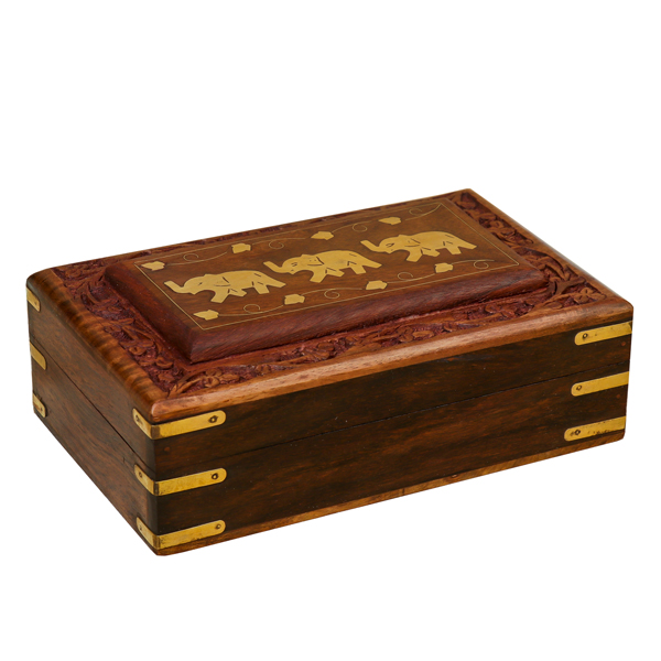 Купить деревянную резную шкатулку с инкрустацией из латуни Три Слона, 20х13 см