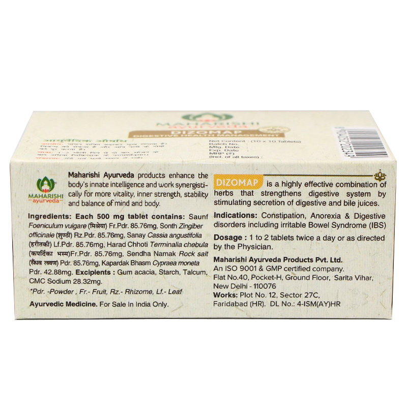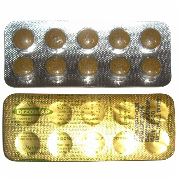 Дизомап отлично устраняет проблемы связанные с процессом пищеварения у людей, регулярно употребляющих жирную, острую, замороженную пищу. Он устраняет  дисбаланс Вата доши, Питта доши и Капха доши, улучшает процесс переваривания пищи. Приём Dizomap способствует восстановлению кишечной микрофлоры после дизентерии, брюшного тифа, применения антибиотиков и хронической диареи. Препарат Дизомап безопасен и не вызывает привыкания даже при длительном приёме.