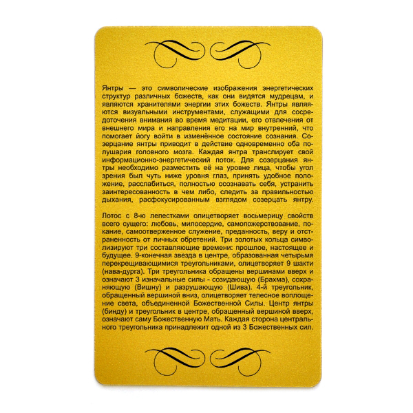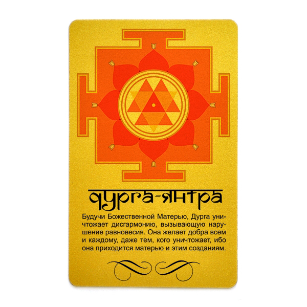 Карта с Дурга янтрой изготовлена из золотистого пластика и имеет удобный размер – размер банковской карты. Это позволяет носить её с собой и при необходимости "подзаряжаться" общением с идущем через неё информационно-энергетическим потоком. Купить янтру Дурга можно как для себя, так и в подарок близкому человеку, который способен оценить такой дар и возможность духовного самосовершенствования.