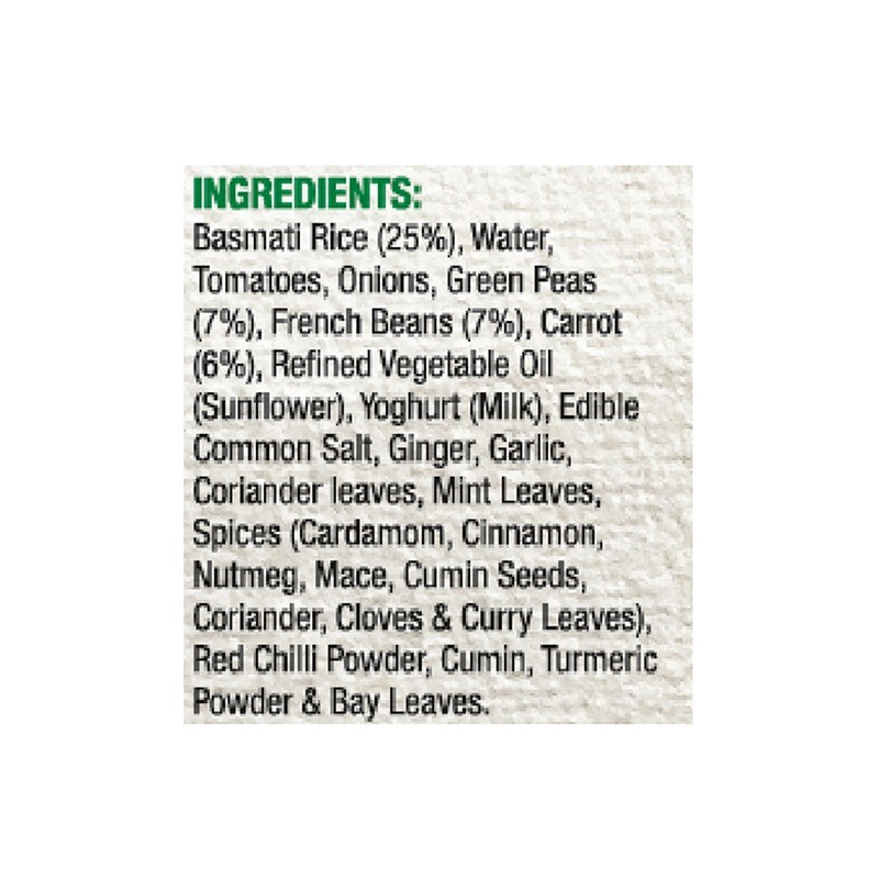 рис басмати (25%), вода, помидоры, лук, зеленый горошек (7%), фасоль (7%), морковь (6%), рафинированное подсолнечное масло, йогурт (молоко), соль, свежий имбирь, свежий чеснок, листья кориандра, листья мяты, специи (кардамон, корица, мускатный орех, маис, семена тмина, кориандр, гвоздика, листья карри), красный перец чили, тмин, порошок куркумы, лавровый лист.
