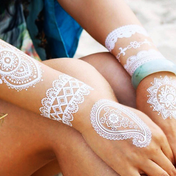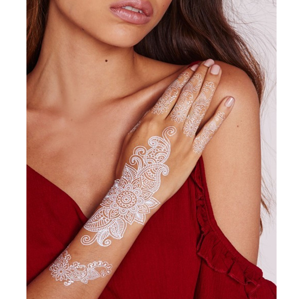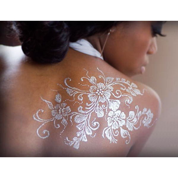Все, кто когда-либо видели порошковую хну, знают, что это мелко перетёртая трава тёмно-зелёного цвета. При окрашивании хна даёт рыжий оттенок и белый цвет хны в принципе не возможен. Всё что в интернете называется "белая хна для мехенди" на деле является гипоаллергенным глиттером на основе акрила. Акриловый глиттер не окрашивает кожу в отличие от хны для мехенди, поэтому не стоит рассчитывать, что Ваша временная татуировка продержится больше 2-х - 4-х часов.