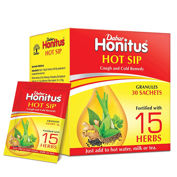 Натуральный аюрведический напиток на основе 15 трав Хонитус Хот Сип порошок (Honitus Hot Sip Granules) от Dabur снимает симптомы простуды и гриппа, оказывает общеукрепляющее и иммуностимулирующее действие.