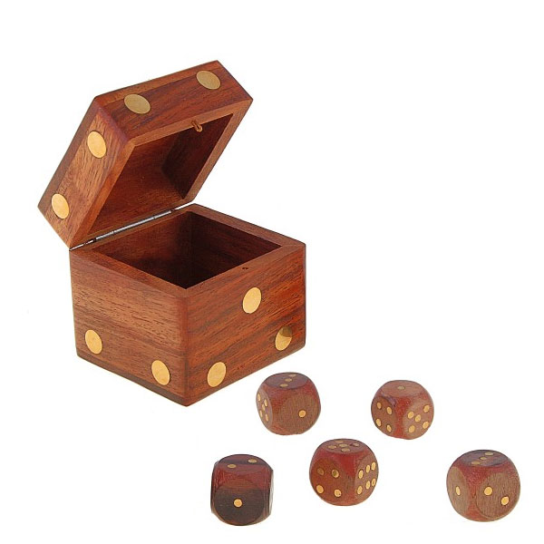 Чтобы сделать необычный подарок надо просто купить игру "Кости в кубе". Аккуратная шкатулка из дерева инкрустированная латунью содержит пять кубиков-заров. Они позволят играть во множество игр - от простых до изысканно-сложных - или узнать, что готовит судьба.