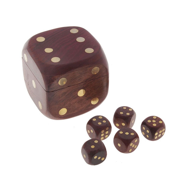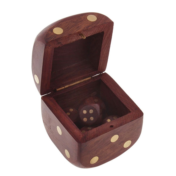 Деревянная шкатулка, инкрустированная латунью, и представляющая собой большой куб с точками. Сумма на противоположных сторонах всегда должно быть равным семи – это классическое расположение. Этот кубик-шкатулка содержит в себе пять кубиков для игры в кости.