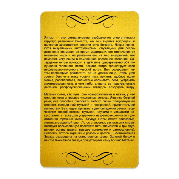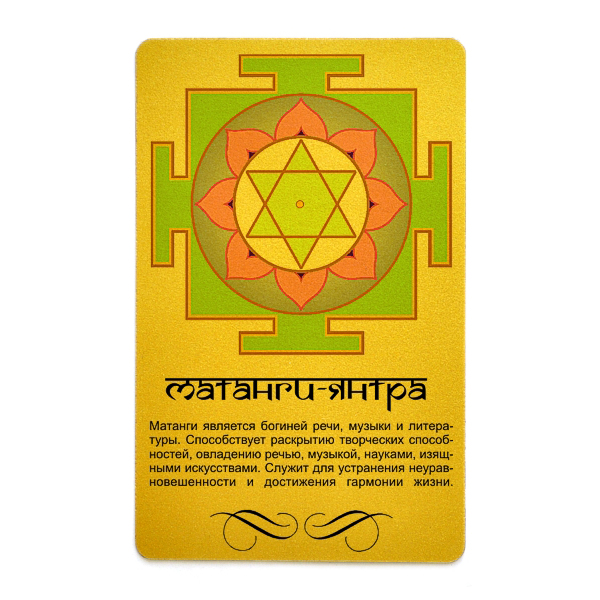 Карта с Матанги янтрой изготовлена из золотистого пластика и имеет удобный размер – размер банковской карты. Это позволяет носить её с собой и при необходимости "подзаряжаться" общением с идущем через неё информационно-энергетическим потоком. Купить янтру Матанги можно как для себя, так и в подарок близкому человеку, который способен оценить такой дар и возможность духовного самосовершенствования.