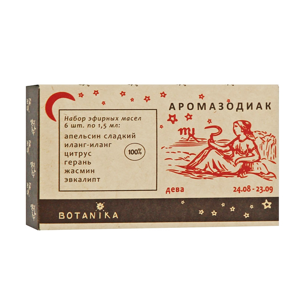 В набор "Аромазодиак для знака Дева" входят натуральные эфирные масла ароматы которых благоприятны для людей родившихся в период с 24 августа по 23 сентября. Древняя наука о соответствии звёзд и человеческих качеств считала, что каждому зодиакальному знаку покровительствуют определённые ароматы. Именно эти ароматы помогают улучшить здоровье и наладить наиболее гармоничные отношения с окружающим миром, активизировать заложенные способности и раскрыть потенциал.