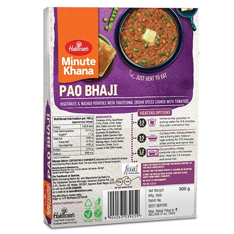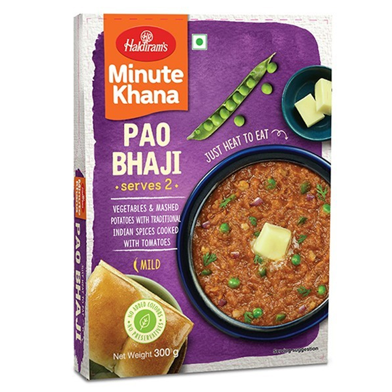 Готовое к употреблению блюдо Пав Бхаджи Халдирамс (Pao Bhaji Haldiram's). Пав Бхаджи это блюдо, которое можно повсеместно встретить в Индии. Изначально возникло как блюдо быстрого обеда для рабочих текстильных фабрик в Мумбаи. Позже Пав Бхаджи начали подавали по всему городу. А теперь Пав бхаджи предлагается везде: от простых уличных тележек до ресторанов в Индии и за рубежом. Блюдо состоит из густого овощного карри, который обычно подается с мягкой булочкой, лепёшками чапати или роти.