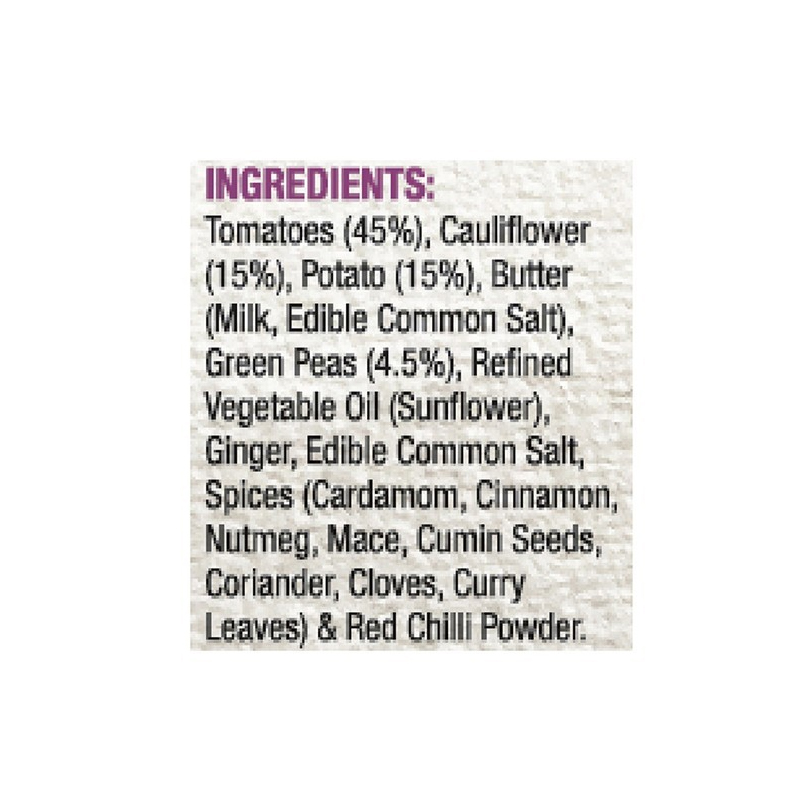 помидоры (45%), цветная капуста (15%), картофель (15%), морковь (7%), сливочное масло (молоко, соль), зеленый горошек, рафинированное подсолнечное масло, свежий имбирь, соль, специи (кардамон, корица, мускатный орех, маис, мускатный цвет, семена тмина, кориандр, гвоздика, листья карри), красный молотый перец чили.