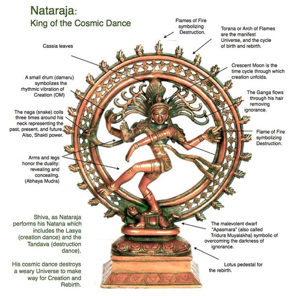 "Натараджа" означает "король танцоров". Шива изображен танцующим. Танец, который он исполняет, - это Тандава - великий Танец Творения (Ананда Тандава) и Разрушения (Рудра Тандава) Вселенной.