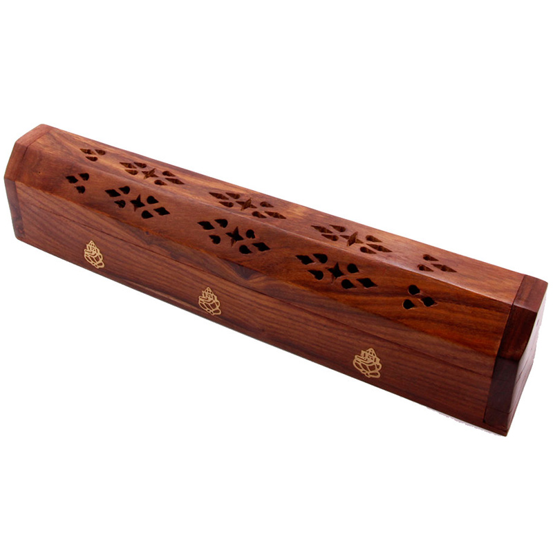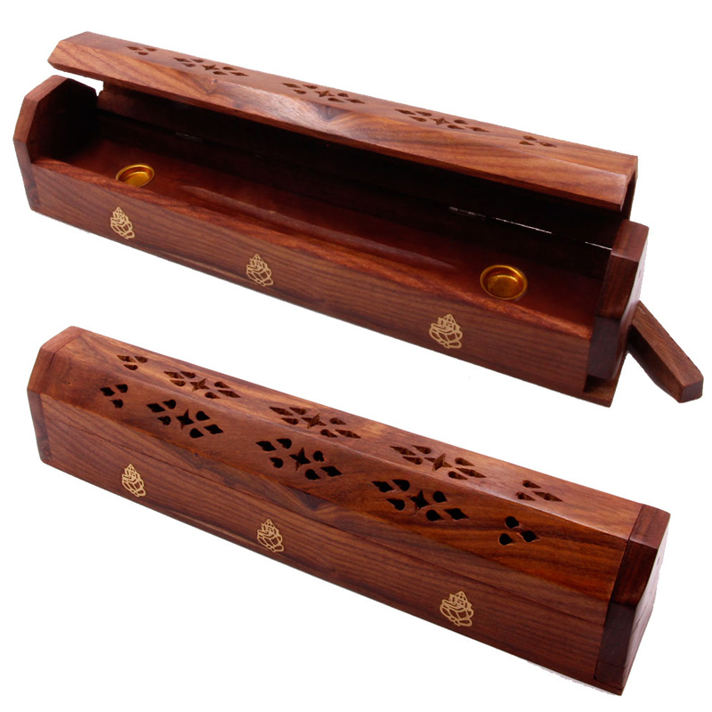 Мы предлагаем купить шкатулку для благовоний, которые сделаны руками индийских мастеров и красиво инкрустированные латунью вдоль обеих сторон. Через отверстия в крышке будет просачиваться дым, и создавать непередаваемые волшебные узоры. Внутри есть две подставки под ароматические конусы и два отверстия для ароматических палочек. Также существует тайник для хранения аромапалочек. Является отличным подарком вместе с парой-тройкой упаковок палочек или конусов.