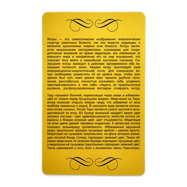 Карта с Тара янтрой изготовлена из золотистого пластика и имеет удобный размер – размер банковской карты. Это позволяет носить её с собой и при необходимости "подзаряжаться" общением с идущем через неё информационно-энергетическим потоком. Купить янтру Тара можно как для себя, так и в подарок близкому человеку, который способен оценить такой дар и возможность духовного самосовершенствования.