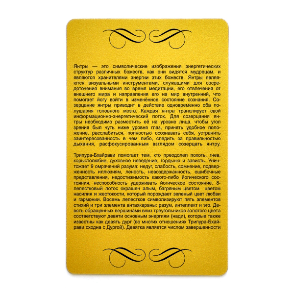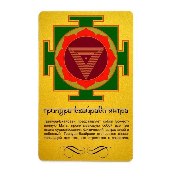 Карта с Трипура Бхайрави янтрой изготовлена из золотистого пластика и имеет удобный размер – размер банковской карты. Это позволяет носить её с собой и при необходимости "подзаряжаться" общением с идущем через неё информационно-энергетическим потоком. Купить янтру Трипура Бхайрави можно как для себя, так и в подарок близкому человеку, который способен оценить такой дар и возможность духовного самосовершенствования.